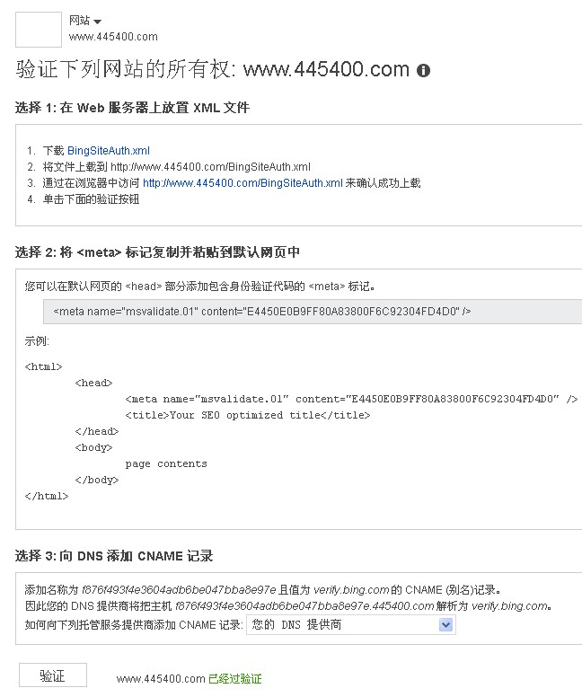 填写以后需要验证网站的所有权,这个跟百度和GOOGLE网站管理员工具验证方法差不多的。