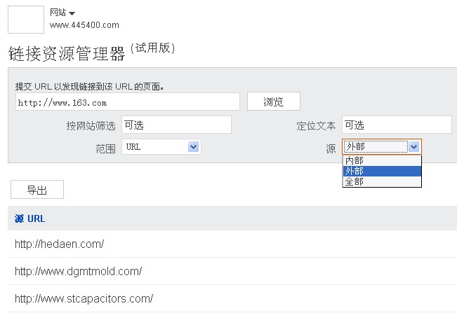 入站链接是网站外链数量及来源网站,点击后面的链接数目可以查看链接详细信息。
