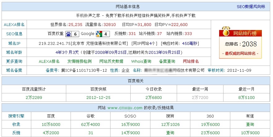 喜欢最新手机铃声的朋友都喜欢一些专业的铃声下载网站,国内比较知名的手机铃声下载网站有手机铃声之家、最牛铃声网等,这些大型手机铃声网站都是由一个大团队在运营的,当然在这些成功的手机铃声站点中也不乏有也有个人站长做的,而且有的站点也运营得有声有色的。那么对于这一些手机铃声下载站的个人站长来说我们要如何制定更加符合自身实际情况的优化策略呢?下面笔者就通过分析手机铃声之家的来简要谈谈个人站长在手机铃声下载站关键词的优化策略。如下图所示: