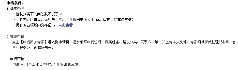 上图中的合作机构是可以加上链接的。如果你有1000个回答被采纳为答案,那么可想而知,你的锚文本外链有多少个是百度的了吧,况且这个1000个回答我想大家都知道怎么做,只不过不要着急,慢慢培养。 那么很多站长跟我一样都好奇,如何成为百度知道的权威专家呢?有人这是多少年的日积月累升级出来的。答案肯定是否定的,请看下面的一张图