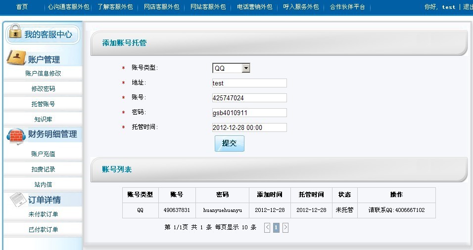 二:账号托管:设置好基本信息后,就可以转到托管账号一栏: 添加账户托管一栏:是需要托管给心沟通客服团队的QQ号! 账户列表一栏:是已经设置托管的QQ! QQ、旺旺、53客服等其它在线客服,都可以通过“账号类型”进行托管。 ☆亮点。心沟通客服团队后台系统,只要有登陆账号(账户请与心沟通团队进行联系),就可以自行进行设置,心沟通根据客户设置的账户进行客服服务的模式,使得沟通更加高效、便捷!