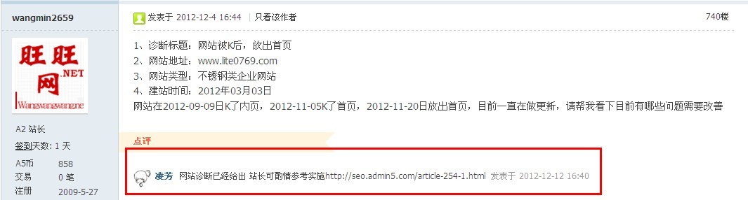 作为一个站长来说,A5几乎是所有做优化人员必须上的网站,每天有海量的知识提供大家学习,有最新关于搜索、营销、点上等等方面的信息,每天有成千上万的网站会采集相关的文章,这样让我们软文外链可以多元化,等等好处….我想各位站长比我都清晰,今天我不是来介绍admin5,而是感谢admin5优化团队,感谢他们提供的义诊服务,同时还将admin5优化团队介绍给一些还比较迷茫或者被K站还摸不到头脑的站长们做一些相关的指引。 鄙人前期为一朋友做了一个不锈钢相关的网站,不锈钢行业互联网竞争比较激烈,做这些项目的有很多。前期效果比较不错,但是不幸的事情来临,大调整中不幸中招,内容页面被K,首页被K。 个人初步判断被K原因:内容质量不高。经过多日努力效果甚微。但是了解到A5优化团队在开展义诊服务,当时抱有试试看的心理在 《A5SEO团队【每日一诊】让您的网站远离“病魔”》帖子中按照要求进行了回帖。所幸几天之后,团队中的芳芳白忙之中抽空给我网站进行了义诊。【20121212】每日义诊:江苏立特不锈钢材料网站基础诊断