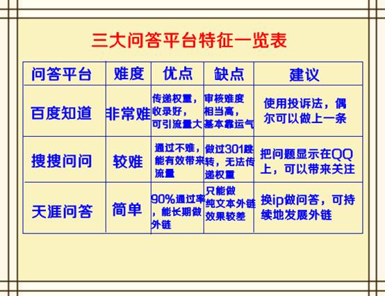 曾几何时,问答平台外链是所有SEOer眼中的香馍馍,无论是其传递的权重,还是其对于流量的引导作用,都趋势着大量的SEOer费劲九牛二虎之力想要在这些平台上留下自己的链接。但是这也带来问答平台外链的泛滥,我们时常可以看到很多自问自答的信息,这无疑对于这些问答平台的用户体验造成了严重的影响。随着问答平台新的审核制度的出台,我想很多SEOer都可以感受到现在问答平台上留下自己的外链已是难上加难。 说了这么多,对于已经踏入的2013年,这些问答平台还能不能被我们所利用呢?答案是肯定的,但是我们也需要注意到2013年的趋势,那就是在2013年做问答外链效果已经没那么好,效率也不再那么高了。 在我们分析论坛外链的趋势之前我们可以先来对现今市占率最大的三大外链做一个简单的了解,如下图的表格所示: