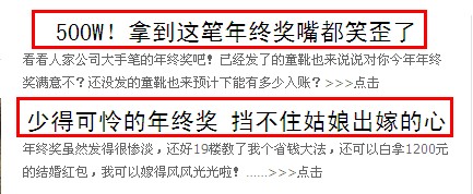 直接用今天19楼的头版标题吧,让我们也来参与参与,在头版中,我们看到了两个大的标题,如果是你,你会想到什么,头版标题是"500W!拿到这笔年终奖嘴都笑歪了"和"少得可怜的年终奖 挡不住姑娘出嫁的心",在这两大热帖中,下面的文字也是小编自己写的,那么当你看到了这样的标题的时候,你有点击的欲望吗?或者说你从里面可以想到什么吗? 就比如说"500W!拿到这笔年终奖嘴都笑歪了",你可能会想,肯定是哪一个人拿到了500W的年终奖,然后分享出来的今天公司的福利,可是当你点击进去一看,却发现,其实不是这个样子,而是一份关于统计各个公司的年终奖的帖子,只是房地产的一家公司一个团队做到了年终奖如此之高的境地,于是小编就顺水推舟一般把这个放在了头版头条的标题位置,于是,我们就看到了令人艳羡的年终奖,你有羡慕吗?或者说你被这个标题误导了吗? 还有一个是"少得可怜的年终奖 挡不住姑娘出嫁的心",每个人的第一感觉不同,大多数人应该是这样“一个姑娘要出嫁了,等等之类的爱情故事”,可是当你打开一看,却为发现另外一个故事,可能会让你失望,但是也会让你有兴趣,因为,这是一篇婚庆类别的帖子,叫做“中国结婚采购大全”,和标题也是相关,但是呢,标题却将整篇帖子形象化了,这样的标题你被误导了吗? 第二点:从热门需求中抒发自己不同的乐趣(其实和用户需求偏离了) 1月15号,《仙剑5前传》发布了,但是没有时间去玩,只有回家过年的时候去娱乐娱乐了;为什么要提仙剑5前传呢,因为没有时间去玩,但是对于仙剑的剧情抱了太大的希望,所以也特别想知道,于是乎就百度了一下仙剑5剧情,却发现并不是那么多人知道的,但是看到了一个人自己做的剧情介绍后,(也是被标题忽悠进来的,不是自己想要的),不得不重新审视自己对于标题这个概念的理解。
