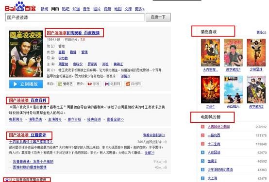 2、 影视类关键词 当用户键入影视类关键词时,用户想了解什么?毫无疑问是在线观看以及了解该影视的价值是否具有可看性。百度对这类关键词进行整合以及推荐,其中百度视频首当其冲,因为大多数用户行为是观看,其次是百度百科、豆瓣影评等,其中右侧更是进行了有效推荐,“猜您喜欢”以及“电视风云榜”得到了充分利用。