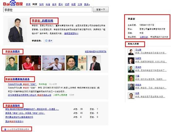 为了最大限度的满足用户体验,对信息的整合力度仍需要加强,百度搜索引擎中还对百度音乐、百度旅游、百度网购等进行了资源整合,当然这远远不够,百度为了能够提高更多更高质量的页面展示给用户,还综合利用百度网页应用和百度开放平台等。同时对一些人名以及影视等搜索结果页面进行了合理布局以及资源有效整合。 1、 人名类关键词 用户搜索人名类关键词时,所要了解的信息很广, 百度搜索引擎为了最大限度的利于每一个用户,其中信息进行有效的整合以及利用,尤其是百度百科、百度图片、最新相关信息以及百度贴吧等,为了进一步改善用户浏览行为,合理利用了右侧,在右侧中整合了人名的出生日期、职位、国籍、毕业学校等相关信息,同时还引导用户进行下一步搜索行为(其他人还搜)。