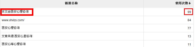 从上图可以发现,“本文由西安心理咨询”的链接名称数量上升,以前是没有这个词的。笔者想了一下,是由于在A5所投软文的段末所留的版权说明的缘故。因为很多网站在转载时,都保留了这些内容,而百度抓取文本链接时,恰好是将链接前的文字作为链接名称的。而这个也可以理解为关键词,只是不是我当初所想而已。看来,这部分内容要真正有效果,就只要全匹配的关键词名称最好,或者用其它符号将其分隔,应该就会避免上面这种情况了。 于是,笔者又想了一下,何不搜索一下这个链接名称,看看有什么情况呢?