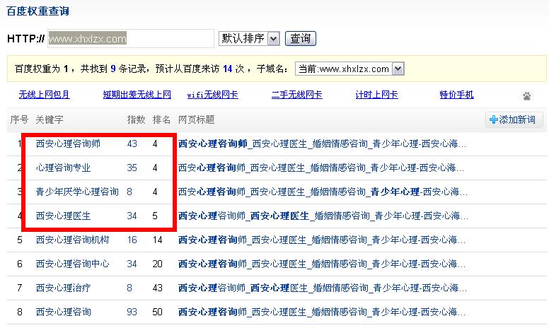 看到这个结果,笔者真是无语了,原来是这样的。看来,文本链接名称在百度排名不仅有作用,作用还不可忽视啊。本来是想通过软文提升排名,但是一不小心,让排名失落了。虽然这个关键词没有竞争度,没有指数,但是还是可以说明一些问题的,希望在优化的朋友们多加小心了。 西安心理咨询 心海心理咨询工作室原创提供,版权所有,文责自负,转载请保留,谢谢观看。 (责任编辑:admin) |