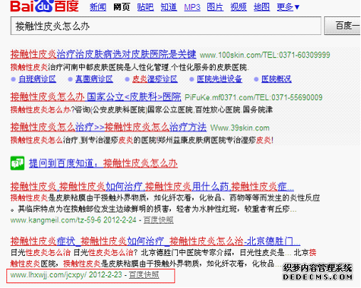 为了让朋友们能够明白,我就找了一个长尾词百度了一下,“接触性皮炎怎么办”如图所示看的很清楚出去百度竞价之外 排名第二的长尾关键词就是了!那么就简单的看着一张图片还不知道人家的优化规则。