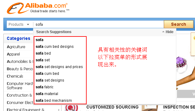 2)输入关键词 这里同样以“Sofa”为例子,在产品的搜索栏上输入Sofa这个词,注意不要马上按"search"按钮,一会儿阿里的平台就出现Search Suggestions的下拉栏目,里面展现用户搜索常用的词汇组合,如sofa bed、sofa set、sofa fabric等,这些都是我们可以参考的关键词。