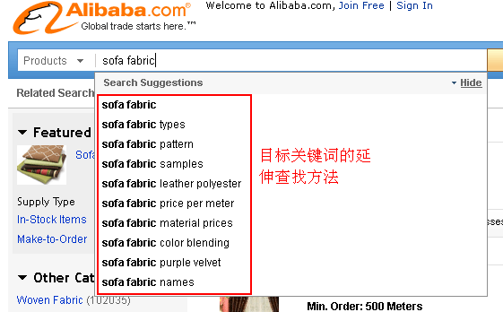 3)找出延伸的关键词 通过上面查找出关键词后,我们可以选择目标关键词进行延伸,发掘出更多的相关性关键词词组。利用刚才找到的关键词“sofa fabric” ,输入到产品搜索后再按一下空格键,就会出现其它带有“sofa fabric”关键词的词汇, 这部分关键词可以作为网站内页产品介绍选用的参考。