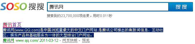 标题内容是页面的最佳概括,应当主题明确,突出重点,内容不宜过长; 每个页面都应该拥有标题内容,避免不写标题,或无意义标题(如“无标题文档”、“网站建设中”); 避免不同页面使用相同标题(甚至全站公用相同标题); 不在标题内容中堆砌关键词,避免影响可读性和被判作弊; “标题党”、“文不对题”对用户搜索体验和搜索引擎收录排序均有副作用,应坚决杜绝。 Meta信息 Meta信息中,keywords和description分别以关键词和概括摘要两种方式描述页面内容,会被搜索引擎特别关注。 keywords部分应填入最能表现页面内容的几个关键词,词与词之间以半角逗号间隔开; description部分应填入一段介绍页面内容的文字,这段文字有可能被搜索引擎选取作为结果摘要。网站首页、索引页、频道入口等无大篇幅页面正文的页面,应该尽可能提供description信息。 keywords和description信息缺失不会对排序权重产生直接影响;在keywords和description信息中堆砌关键词作弊可能受到搜索引擎惩罚。 腾讯网的description信息: