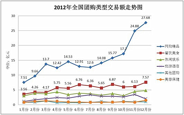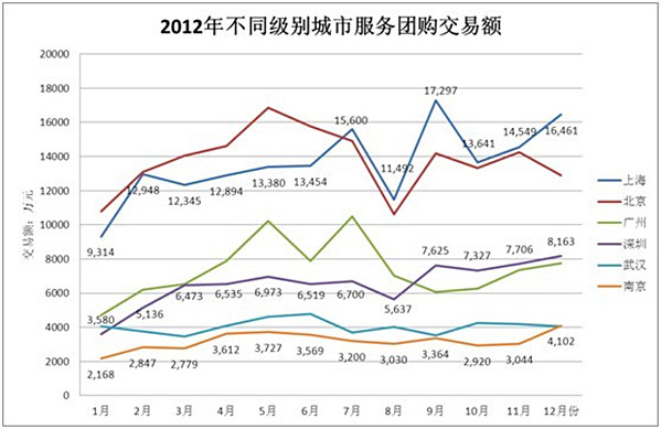 图1.9:2012年不同级别城市服务团购交易额 针对城市级别和服务团购交易额的关系,速途研究院分析师选取了以北京、上海为代表的超一线城市,以广州、深圳为代表的一线城市和以武汉、南京为代表的二线城市进行分析。 从图表中可以看出,同一级别城市的交易额相差较小,而不同级别城市之间的交易额泾渭分明。超一线城市的月交易额基本维持在一亿元以上,而一线城市的月交易额则基本保持在6000至8000万元的水平,二线城市的月均交易额则只有一线城市的一半。服务团购交易额水平主要受城市发展程度的限制,城市之间的差距短期内无法消除。 另外,超一线城市的服务团购交易额波动较大,相比较下武汉、南京等二线城市服务团购交易额比较稳定,呈现一条平稳的曲线。 回顾2012年,经历了团购资本冷却、团宝网“死”而复生、56%的网站关闭、各网站抱团取暖之后,窝窝团、满座网、美团等网站纷纷宣布盈利,团购行业经过又一年的洗牌,各网站在挣扎中学会理性广告投放、合理配置员工、互相寻求合作,团购行业门槛提高,行业格局日益明朗。 通过数据研究可以看到: 1.团购行业作为新生事物的泡沫逐渐散去,用户关注程度趋于稳定,团购市场逐渐走向成熟。 2.中国团购出现的三年间,团购交易额从2010年的25亿急速上涨到2011年的216.32亿元,并达到2012年的348.85亿元并将继续上涨。速途研究院分析师预测,2013年全年团购交易额将达到700亿元。 3.2012年毛利润较高的实物类团购交易额增长25%,超过服务类团购。餐饮美食类成为服务类团购最大的细分市场。 4.2012年服务团购城市分布,北京和上海遥遥领先,团购交易额与城市规模和发展程度密切相关,短期内布局不会改变。随着大型团购网站向大中城市收缩,中小城市的本地网站因此受益。(速途研究院出品 数据支持领团网) (责任编辑:admin) |