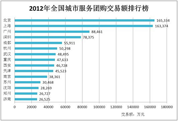图1.8:2012年全国城市服务团购交易额排行榜 速途研究院分析师按照团购城市分布对2012年团购交易行为进行了分析。2012年团购业务覆盖城市城镇数量达到675座,排行榜十强城市团购交易额占全国团购市场的36%,环比增涨1%。北京、上海、广州排名前三,交易额分别为165334万、163374万元和88461万元。 从图表中可以看到,城市服务团购交易额与城市等级有密切联系,呈现出明显的分层现象。北京和上海两大超一线城市处于领跑地位,广州和深圳两个一线城市的交易额紧随其后,分别为88461万元和78375万元,仅为北京和上海的一半;以成都为首的二线城市交易额差距相对较小。 速途网分析师认为图中上榜城市的交易额受城市规模和发展程度限制,其差异短期内无法发生较大改变。服务团购的发展方向在中小城市,提高团购城市覆盖数量、挖掘本地消费潜力是交易额继续上升的突破点。