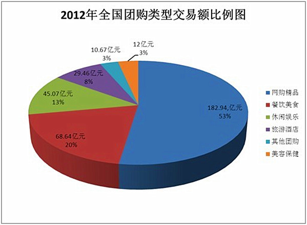 图1.6:2012年全国团购类型交易额比例图 速途研究院分析师按照团购商品类型对2012年全年团购交易额进行了划分,得到了各团购类型的交易总额,并以此为基础制作了饼状图。 较2011年,实物类团购市场份额增加25%,团购行业的产品类型由服务类团购向毛利润较高的实物类和奢侈品扩张。从图表中可以看到,2012年网购精品交易额占比53%,服务类团购交易额占比47%,已经被实物类团购超越。 服务类团购中,餐饮美食类团购收获了68.64亿元的交易额,占比20%,成为本地服务类团购最大的细分市场;休闲娱乐类团购占比13%,在服务类团购中排名第二;旅游酒店类和美食保健类团购以9%和4%紧随其后。