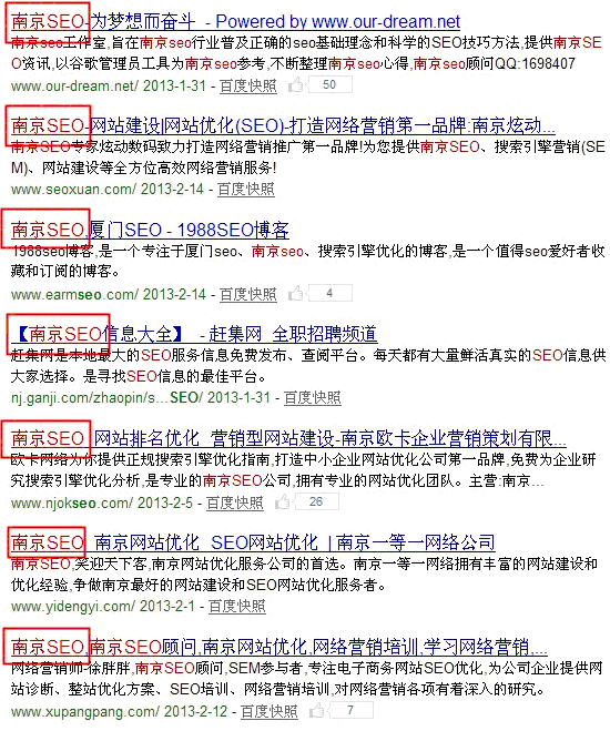 百度左偏原则是一个新的SEO优化概念,那么什么是左偏原则呢?笔者通过对百度搜索引擎关键词排名的算法机制,发现了一个新奇的现象,这种现象笔者对它定义为左偏原则理论。 左偏原则既然是一种现象,那么又是如何被发现的呢?百度搜索引擎是国内最大的搜索引擎公司,百度搜索引擎排名算法一直牵动着两百万站长的心,稍微一点点的算法变动,都会引起业界不小的震动,之前百度中文分词算法的变动我们已经做了破解,先自嘲一下,笔者对百度搜索引擎算法的研究以及优化已有三年,通过一种常态化的现象,笔者发现百度搜索引擎在网站title关键词上,是非常注重的,而很多所谓的SEO大师并没有关注到百度搜索引擎对网站关键词位置的微妙变化,笔者通过半年的研究和测试,终于发现这一现象,通过这篇文章给屌丝站长们一个启发。 那么百度搜索引擎对网站title到底有什么隐性要求呢?其实百度对网站title关注度非常大。首先站长们必须懂得如何选择核心关键词技术,然后选好后,就可以根据百度左偏原则理论进行操作,从而大幅提高关键词排名。笔者这么说可能读者听得一头雾水,那么笔者就从实战方面来分析百度左偏原则在搜索引擎排名中的具体效果。笔者的博客是关于南京SEO方面的,那么我就从“南京SEO”这个关键词来分析百度左偏原则是一个什么样的概念,请大家看下图。