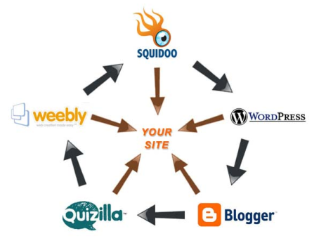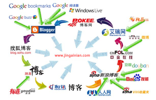 图中所示如WordPress等为站群所建立的站点,然后站点进行一个单方向的链接形成一个环状,形状上看酷似一个车轮。传统的链接大致是由锚文本单向导入,如WordPress链向Blogger,而车轮外链的黑色箭头示意的环状单向链接则可使得蜘蛛循环爬行,并且棕色箭头使得环状的单向链接的权值最终导入到自己的网站。 2)扩张后的车轮外链 将上面简单的车轮模型进一步扩展,使用一些web2.0站点如开心网、百度百科、19楼等、人人网等分享互动性质的网站进行链接,继续加强Blogger权重培养。 如下图所示: