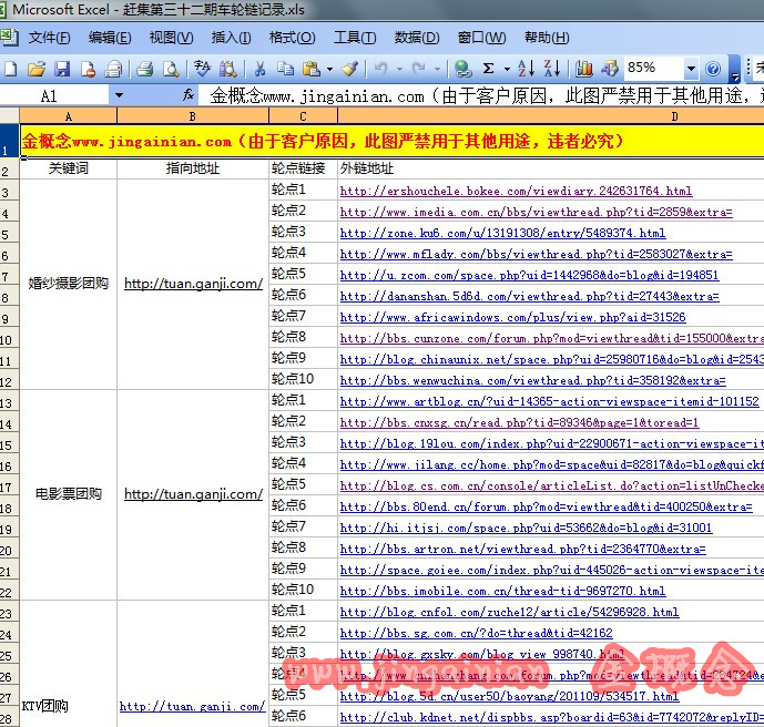 “剖析外链建设的技巧之“论坛外链””()推出后,不少朋友希望笔者能继续给大家分享下有关外链的一些知识和技巧,其实外链存在的种类大家都很清楚,大家常用到的无非就是博客、论坛、友情链接、百科、留言板、分类信息等,外链人人都可以做,但是做的时候相关的技巧,是很多站长所并不熟悉的,那么本文来谈谈笔者认可的外链众多形式的一种:“车轮外链” 很多朋友提出之前那篇有关论坛外链的帖子,最后附件给大家的干货是亮点,而且说到文字类的东西,站长都很容易产生视觉疲劳,那么笔者花了一点时间整理了一些图片,相信可以更容易被大家接受。 好了,闲话少絮,首先看下笔者公司之前给客户做的车轮外链案例。