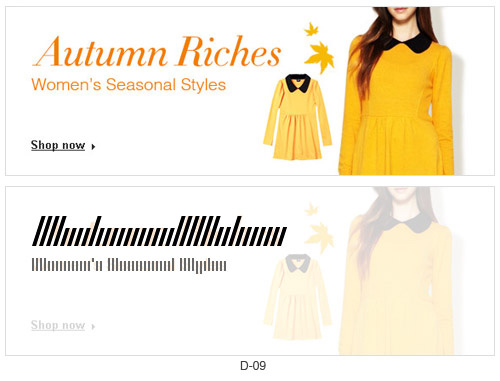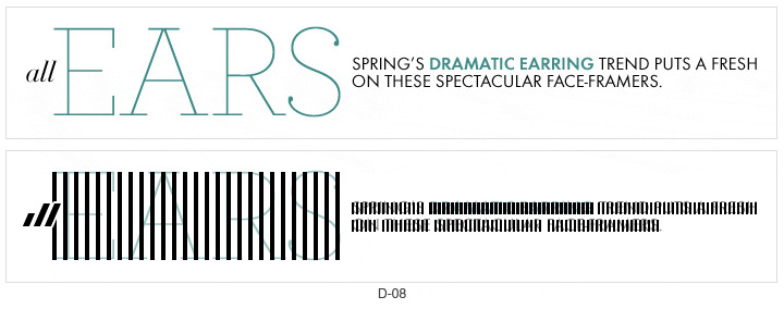 图(D-08),如果这个文字排版是一首曲子的话,从左到右,先是轻快的斜体韵律开头,突然变化出明快的细线条大曲调,吸引人注意,最后出现一连串低调的曲子补充,让人看到这个文字就明白,是时尚的饰品。特别是开始的斜体,让画面在女性的稳重中透露出活泼。