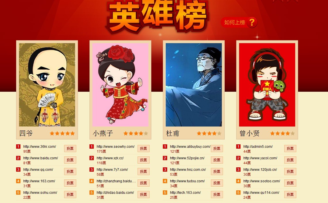 顺便分享一个不是秘密的小秘密,当然这得看运气拉,英雄榜的排名各不相同,主要是看你网站所在的人物有没有厉害的网站,我的网站难度就比较大,很明显admin5所在的曾小贤的英雄榜竞争很小,现在只要超过45票就能拿到 iPod Nano 7代拉 我肯定也不会落伍,我的网站是: 邪恶漫画 我的投票地址在下面。 希望大家可以帮我网站投一票:?site=www.warpv5.com# (责任编辑:admin) |
