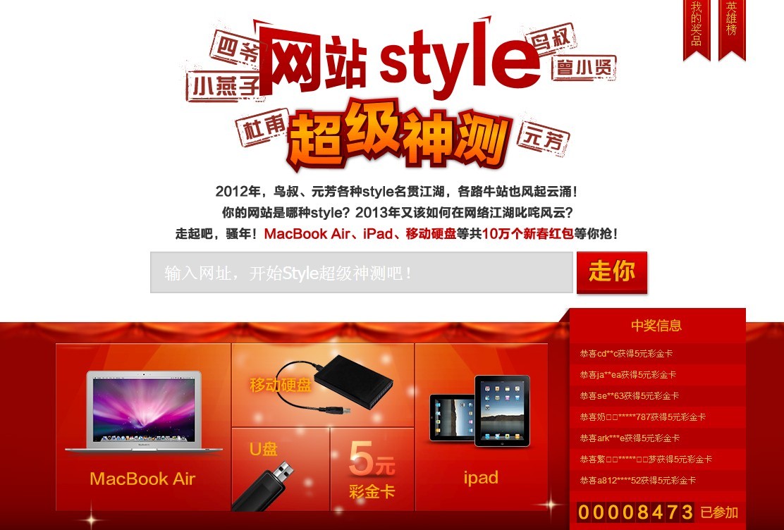 今日,百度站长平台在其首页挂出了首页聚焦和全站顶部通栏广告去宣传此活动,活动首页的奖品很是诱人。 而规则很简单:用户完成Style测试即可获得新春红包,每小时共5次机会。 当然一小时内重复测试同一网址视为无效,不可再次领取红包。 如果您是网站管理者,可以通过在站长平台验证的方式领取“英雄勋章”(已验证过的网站会自动佩戴),冲击“Style英雄榜”。 您可以为支持的网站投票,每个ID只能为一个网站投票1次。 每个style中得票最多的网站将获得特制英雄奖杯和Apple iPod Nano 7代 1台,第二名和第三名网站将获得移动硬盘一个。