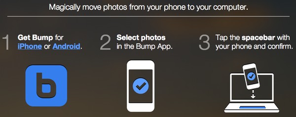图7 2. 利用特定的交互方式,像Bump连接Web端(图8),通过手机的重力感应感知到「bump」,然后将地理位置与碰撞时间等信息上传到服务器,服务器根据最接近的时间点和地点判断出手机或者电脑的IP地址,为它们建立通信配对。虽然也可用来进行用户登录,但安全性较差,真要采用这种方式,可就要改进一下相关的流程。