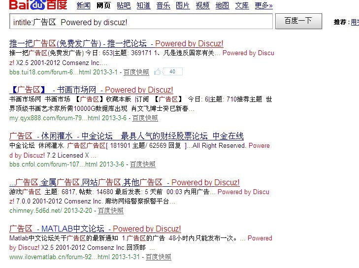 2、学会使用Intitle(注:限制搜索范围在标题之中) intitle:关键词 Powered by Discuz! intitle:关键词 Powered by phpwind intitle:关键词 powered by bbsmax intitle:关键词 powered by Dvbbs intitle:广告区 Powered by discuz!