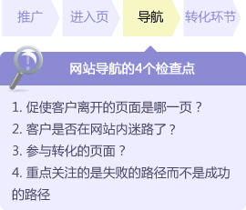 把客户引导到想要看的页面 当网站进行了推广或者实施了LPO(登陆页优化)以后,可能网站的访问量会大幅度提高,或者跳出率会大幅降低,但是最终的目标并不仅仅如此,转化数是否也能达到预想的目标呢? 当用户想要为了找到自己想要的内容在网站反复点击了好多页面以后,可能找到了结果离开,或者没有找到结果而沮丧的离开了。这里想要讨论的是,如何防止客户在浏览网页过程中因为没有找到目标页面退出。 导航过程中的4个检查点