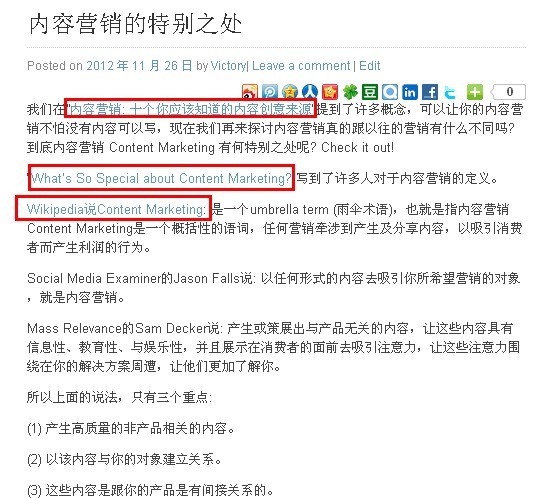 为了达到最好的效果,花时间(1)测验/调查800名以上的群众;(2)形象地展示结果;(3)在你的网站上发布结果;(4)然后在呈递给媒体时要附带上更多信息、数据和图表以便供其使用。一个现成的例子就是被 eMarketer 选用的 my Twitter poll(我的 Twitter 调查)。 如果你没有时间来满足这些民调标准 (PDF),那就雇用公司来为你做这些民调。记住,如果你不花足够的时间和资金对足够多的群众展开精确的调查,那么有名望的媒体网站是不会采用你的材料的,Google 也不会“采纳你的内容”。 6.修订/更新 维基百科不是一天建起来的,它的内容经过了撰写、修订、更新、反复修订等一系列过程。所以请想一想:你去年写的关于“某某主题”的内容能否做下更新?关于这个主题有没有新的研究出来?与其创建新的博文,为什么不对旧的做点更新呢? 更新/修订内容的一个最简单的方法就是创建和更新链接。重读旧的内容看看你是否已经对在之前发布的内容中提到的主题添加了新内容。比如下面的这个例子,我曾写过有关“内容营销的创意来源”的内容,现在就可以给它加链接。又或者,Wikipedia上有对于内容营销比较详细的解释,现在你就可以把链接添加到原来的资料中。