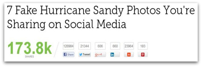 如果你觉得平铺直叙太单调,那就让它有意思一点。Mashable 的“7张虚假飓风桑迪照片”有451个网站与之链接,173,000人分享了它!这些照片甚至可能不是 Mashable的,但是这里有这个帖子的社交媒体统计: