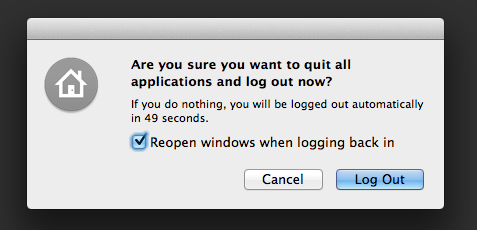 于是我们应该注意选项的文字表达,将是否的选项替换成直接明了的动作词汇,例如在 Mac OS 中注销的对话框,以「注销(Logout)」取代「是(Yes)」「取消(Cancel)」取代「否(No)」,这样简单的替换,即使不需要阅读对话框的内容,也可以清楚明了的知道我现在应该要注销还是取消我刚刚做的动作。