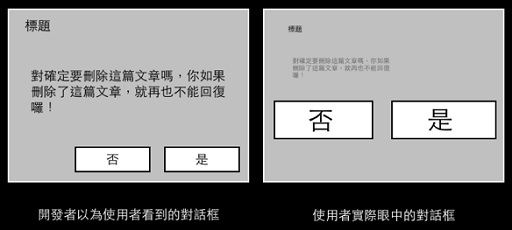 对话框最常见的不当设计就是选项上的文字出现:「是(YES)与否(NO)」,回想在学生时期考试的时候,O 与 X 在是非题中是唯二的两个答案,而出题者会透过文字叙述上正反的误导,来测验学生是否真的清楚了解,先不论这样的测验方式到底对学习以及知识的建立到底有没有明显的帮助,使用者可不想在开心的使用你的程序或服务时,还要小心翼翼的了解你对话框的内容。 我们当然可以细心的设计对话框中的文字,让用户清楚明了对话框的讯息,但是在大部分的情况下,我们几乎根本不会逐字去阅读讯息的内容。 你必须要假设用户除了对话框上的按钮外,不会阅读任何其他讯息(对话框的标题或是讯息内容)。 – John Gruber of Daring Fireball