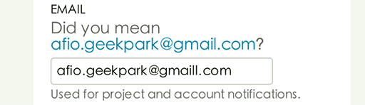 动态效果/实时反馈 6. 在 Kickstart 的注册页面中,当用户邮箱后缀输入错误时(如将 Gmail 敲成 Gmaill 或 Gmaiil)它会给用户实时纠正提示。