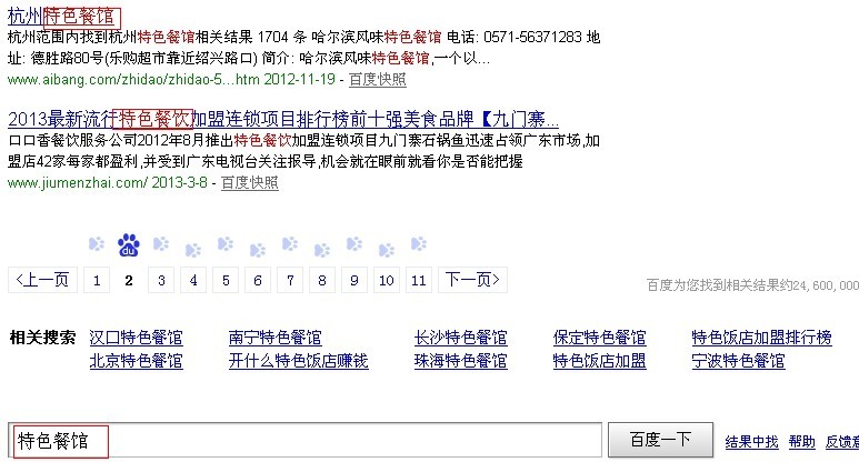 这是我在百度上搜索特色餐馆的结果,我的网站标题并没有出现特色餐馆这个关键词,我的网站排在第二页了。大家看看红色框里的虽然我的标题是特色餐厅,但同样被标红了,说明在搜索引擎眼里,这两个词是一样的。 大家再来看看360搜索的结果