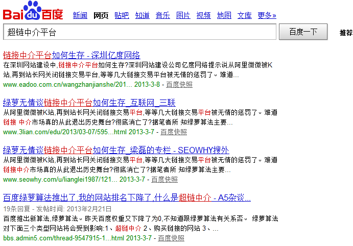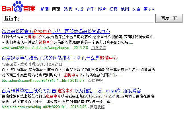 这是很早的一个话题了,百度2013年2月19日在自己的公共平台推出了新的算法通知,虽然对于时刻关注seo动态的seo者们认为,这可能没必要再提起,但笔者还是想再三强调一下,一个是给自己提个醒,另外一个还是对这些公告蕴含的意义总结一下,便于后期的优化不触碰这些规则,以此来自勉,如果还有站长未看到此次算法更新的,那么看看此文,也给你的网站提个醒。 我简单总结成以下几点,如果大家有不同意见,欢迎指出: 1、远离超链中介 不去超链中介平台挂自己的链接,就算不是买卖,也有可能被误伤受到降权处理,严重的会受到百度的直接K站处理,现在百度对超链平台的打击力度是相当严格,可以看看笔者搜索“超链中介平台”和“超链中介“的关键词,已经在首页和后面几页看不到这样的平台出现。