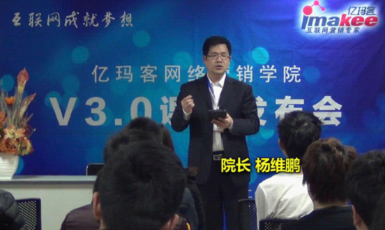 2013年,中国互联网和电子商务高速发展,中国经济向互联网新经济时代转型,网络营销在其中扮演着重要的角色,作为中国网络营销培训领军者与先行者和中国网络营销行业标准的推动者,2013年3月19日,亿玛客网络营销学院( )在北京中关村海龙大厦举办ImakeeV3.0课程体系发布会。 亿玛客网络营销课程发展史 作为亿玛客网络营销学院创始人,杨维鹏老师没有想到,从2007年10月开发网络营销课程的时间算起,屈指算来,已有6年的光阴,课程体系也从最初的1.0版本升级到3.0,大约每隔一年课程就有一次小的升级,隔两年有一次大的升级,这也暗合了计算机行业流行的“摩尔定律”。