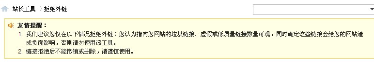 百度说,建议一下情况然后使用该工具,“垃圾链接、虚假或低质量链接数量可观” ,然后屏蔽之,然后再加上,操作不可逆,从另一个角度上看到的是系统会对这个网站的外链进行一个整体性的屏蔽,然后控制链接的权重传递,最终实现绿萝的功效。 在前一段时间的链接更新之中,绿萝上线,多少因为链接而收到影响的网站权重降低,但是又有多少因为内容质量的优越而得到网站排名的提高呢?其实这些都是相互的,在互联网平台上,内容将远远比外链重要,这个也是趋势。但是对于外链还是要有所担忧,那就是垃圾外链,何为垃圾外链,比如说在一个*情网站上出现你的链接,然后诱导点击之后,却发现跳出率接近100%。这样的情况是你想要的吗? 百度拒绝外链工具,针对这些外链,有着它独一无二的本事,但是呢,后面一句话,操作不可逆,试着想一下,如果你发现一个垃圾外链,然后屏蔽了这个网站,然后这个网站的链接全部失效了,那又当如何,会不会因为链接的丢失而降权呢? 现在在百度的外链中,一般都会显示出绝大多数所能够引出的外链,基本上也是一个网站所有的外链,有时候看到如此的外链的时候,你是不是也会诧异呢?毕竟很多外链都是在你不知道的情况下,出现的,比如说