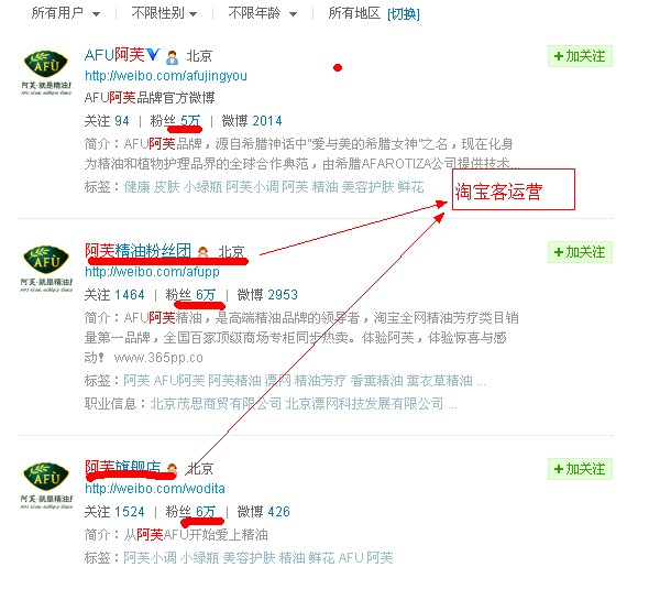 前几天的写的《反思一段失败的创业经历:从月收入3万元到月收入1万元》受到很多朋友的关注,但是里面分享的方法,今天的效果已经不是那么的好了。随后我又写了一篇《车品弘智与卓卡车品淘宝站外营销情况对比》,这篇文章没有受到很多人的关注,个人感觉第二篇对于淘宝大卖家的指导作用更大一些,这篇文章是对淘宝站外营销的一点个人看法。接下谈谈个人对淘宝站外营销的一些看法。 一、SNS营销 个人认为针对SNS营销,主要可以考虑新浪微博、腾讯微博、QQ空间这三个地方,当然淘宝大卖家可以根据自己 所在的行业来选择重点放在哪里。以下对SNS营销都已新浪微博为例。(插播一下:我的新浪微博ID是淋漓SEM) 淘宝大卖家在新浪微博营销情况分析 1、比较出名的一些大店铺的粉丝能够达到几万人,但是互动效果都不是很好。更多的淘宝大卖家是开通新浪微博,但是没有人气,其实就是食之无味弃之可惜的鸡肋。 2、那么为什么做不好呢?多数公司员工,都是抱着打工的心态,老板让更新微博,结果就每天发几个段子、冷笑话等等,用户才懒得看企业发的这些烂东西了。想看段子、冷笑话等,人家微博营销团队发的更好。 3、那如何解决微博营销难这个问题呢? 那就投入人力物力好好做啊。如果没有人力物力可投,个人建议可以考虑承包给淘宝客高手来做。建议看看下图,是雕爷家阿芙精油的例子,阿芙自己的官方微博粉丝是5万人,但是下面两个淘宝客的粉丝都已经达到6万人了,而且下面两个微博的互动效果也不比官方微博的差。不得不说高手都在民间啊,人家淘宝客做的是不是比你们家店里伙计牛多了。
