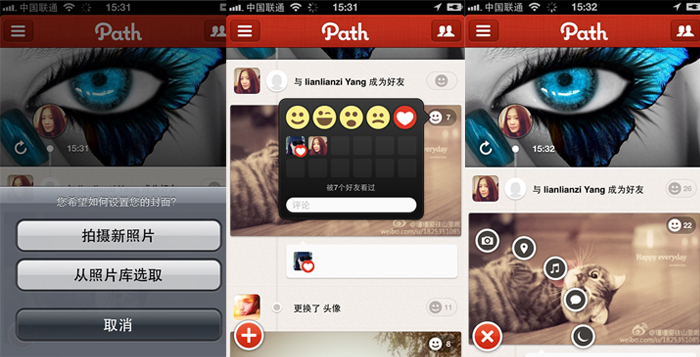 像许多视频类产品都会开发与之产品配合使用的加速器,下载前会为产品做一个卖点的宣传。实际就是先为用户建立预期:说明这款产品使用后可以获得什么什么样的体验,努力使信息与用户有直接关系,吊起用户的胃口,目前很多手机应用都会在开篇有用户引导画面也会运用这种方式。 手段6.让用户表现自己 我们出去旅游时乐于拍照片留下属于个人的标记,表明我来过这里,我做过这个或者这就是我。家里装饰成田园风格,日式风格…贴满贴纸的手机…我们喜欢表现自我的个性,感受和想法 例如:Path 这款应用是典型的用户表现型的产品