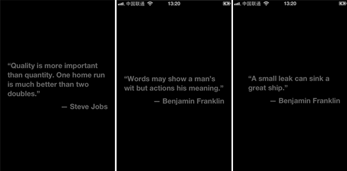 如果你的设计无法吸引用户,存在着无法让用户觉得有意义或印象深刻的风险。那么加一点幽默吧,它能使交互更人性化,引导用户产生许多积极的心理效应。 手段3.设置奖励机制 稳定性和可控感固然是是用户界面的关键原则,不过出乎意料的事物也能带来好处。因为当用户不知道将面对什么的时候,他们的渴望也必然会增强。 说到这不得不再次提起clear这款应用: 用户清空条目之后,提示语会发生变化,这里引用的是一段励志名言。它们出现在用户不可预知的时候,是出乎用户意料之外的。但是它的意图又不是要加强一种特定行为,而是为用户带来喜悦。