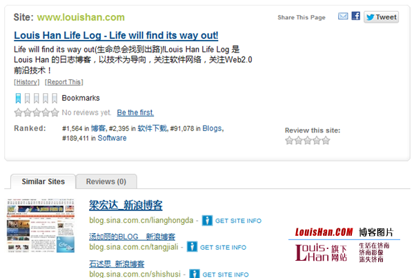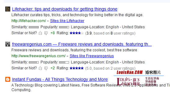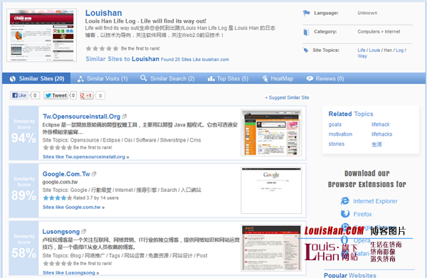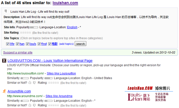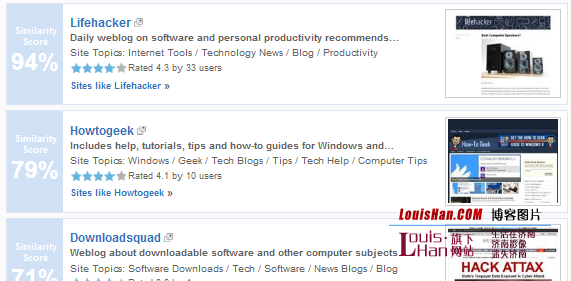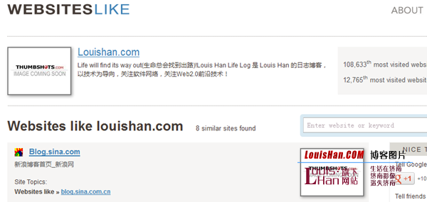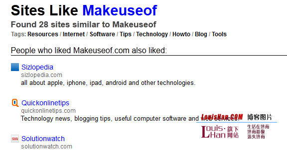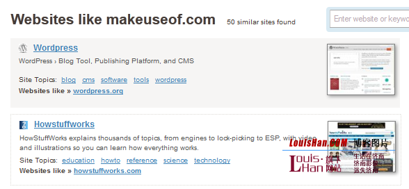 Websites Like 号称拥有“最大的公共相似网站索引”,使用他们自己的算法根据链接地址或者关键词发现相似网站。在我的测试中,Websites Like 对 Facebook 支持良好,建议网站包括 Twitter、MySpace 和 Orkut 等等。当我输入 MakeUseOf 时,它建议我尝试 WordPress、Microsoft 和 IBM 来发现相似站点。唯一提供的而且比较偏的相似站点是 HowStuffWorks。 译者对 LouisHan.COM 的测试。
