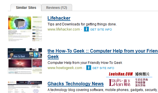 更以书签扩展服务出名,XMarks 也提供了基于 URL 和关键字的相似网站搜索服务。你不需要安装扩展来使用,进入网站之后,使用页面右侧的搜索框即可。XMarks 为关键字和 URL 都提供了自动补全功能,非常方便。在我的测试中,XMarks 对 Facebook 和 MakeUseOf 的测试都很好,尽管 Google+ 不在 Facebook 相似站点列表中。MakeUseOf 的列表包括 Lifehacker、HowToGeek、GHacks、Engadget 等。 译者对 LouisHan.COM 的测试不尽人意,列出的相似站点都是诸如梁宏达、汤加丽、石述思等的新浪、网易博客。