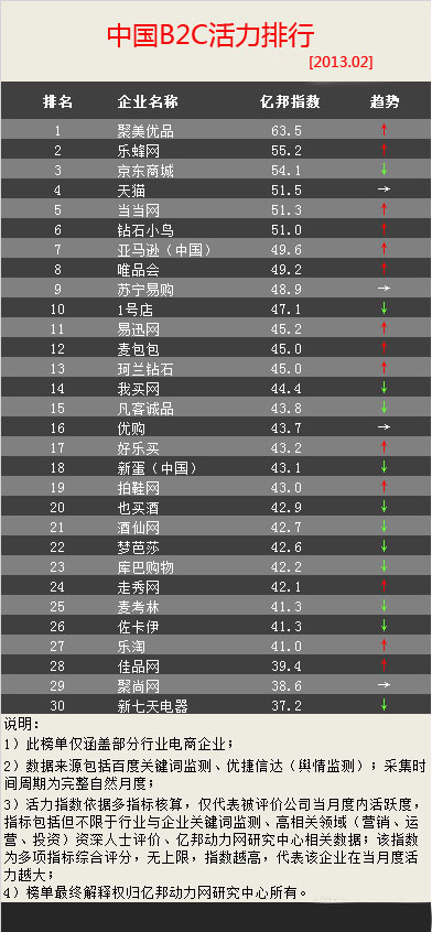 3月20日讯,唯品秀最新发布“中国B2C活力排名”的数据显示,2013年2月,国内综合型B2C平台均为下降姿态,但如乐蜂网、聚美优品之类的化妆品B2C则轻松爬到了榜首。 2月B2C活力前十名:聚美优品、乐蜂网、京东商城、天猫、当当网、钻石小鸟、亚马逊(中国)、唯品会、苏宁易购、1号店。