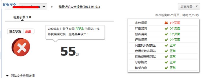 听说,百度又大更新了,在百度眼里,每次更新的时候,会有一份报告,然后说,这是属于哪一个网站的案例被误伤,然后解决掉,于是过了几周,这些网站都被百度稳定住了,然后就慢慢的按照正规的方式做优化即可,可是还是有很多网站都是用自己的方式在做网站,很多时候都不知道为何被百度处理了一下下,这篇文章,就为常见的一些问题带了一些解法吧,希望可以成为最美的光景。 1)网站安全属于第一大点,安全才是最网站的根本 今天在360站长工具中,测试了一下自己的网站安全问题,如图