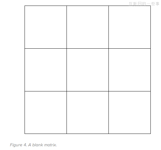 “用户”已经成为一个负载词(loaded word)。我们总是把自己的信念、诠释、和情感一股脑附加在“用户”和他们的需求上。在几个团队待过之后,我开始意识到一个普遍存在的问题:并不是所有的利益相关者和团队成员对“用户”一词的理解都是一样的。这就是为什么在内部拥有一套用户角色集合可以很好地解决语言沟通上的问题。 然而,用户角色的问题在于它只是把单个特定的用户场景展现出来,在研究一系列连续的用户场景时,它并不是最好的工具。 矩阵图的方法透过不同场景的视角,帮助我们研究已知的、未知的用户行为和动机。我已经用这种方法做了下面的事: 创建关键受众角色 理解或验证价值主张 确定优先研究的领域和产品功能——确定我们已知的信息和缺乏的数据 找出哪些功能是非常重要的 它的本质是一个用来理解用户模式的结构化头脑风暴工具。它最好的地方在于可以很容易的“解压”(unpack)那些不同利益相关者对用户做出的假设。 第一步:画出矩阵图 我已经在多次与顾客以及工作坊参与者的交流中用到这种思考方法,对我来说3×3矩阵是最有效的。可能是因为它可以给我提供足够多的样本,而且不会过于精确——因此可以避免出现分析麻痹症。