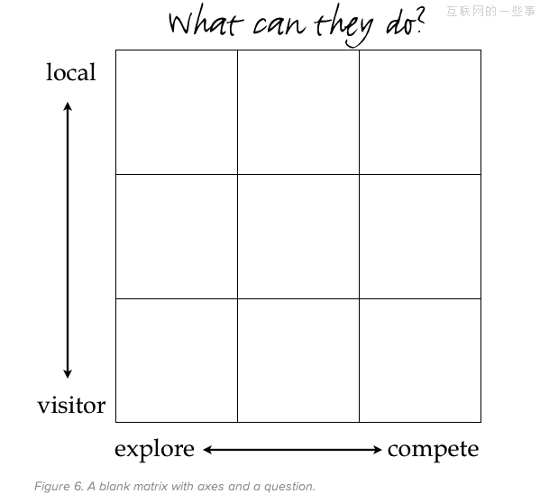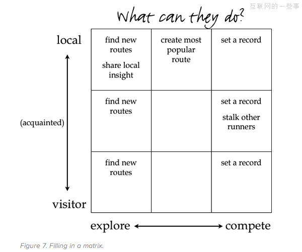 第二步:确定重要的坐标轴 接下来需要确定我们设计的系统中可以包含哪些不同的用户(矩阵格子中所代表的不同用户群)。 我们看一个为跑步者设计的潜在社交应用。本地跑步的用户可以发布跑步路线,游客可以通过应用找到这条路线。 我们可以假想一下虚拟竞争因素。一个跑步的用户在之前某个时间发了一条跑步时间的信息,你看到后想在同样的路线上打破他的记录。亦或是当你到达一个新城市后想找个路线小跑一下领略这个城市的风光。试想一下我们需要满足用户的哪种行为属性才能能吸引用户使用这个应用? 我倾向于选择“反对”(opposing)属性。你可能不同意我的观点,然后列出如下属性和对应的用户场景。 探索(explorative) “我想通过跑步找一种感受这座城市的新途径。” 竞争(competitive) “我想和别人赛跑或者我想自我超越。” 频繁(frequent) “我经常跑步,每周几次甚至每天一次。” 偶尔(occasional) “我每周跑一次,或者更少。” 你的坐标轴可能会是这样: 感兴趣(curious) ↔ 在使用(engaged) 社交(social) ↔ 个人(individual) 探索(explorative) ↔ 竞争(competitive) 频繁(frequent) ↔ 偶尔(occasional) 游客(visitor) ↔ 本地人(local) 对于正在从事的项目,你可能知道一点当前的用户的信息,也可能什么都不知道。和我们一起为这款社交应用出点子的团队属于一个运动鞋公司,而且全部由跑步运动员组成,他们经常往来于在各地参加马拉松比赛。这个团队在之前做过一些研究,并且获得一些从新手到高级跑者各个级别人群的相关信息,同时也对使用过他们曾开发过的一款web应用的人群有些见解。 在你用此方法做练习的时候,要谨记哪些是你已知晓的用户信息,哪些是你假定的。从上面列出的坐标轴中选择两条你最感兴趣的,或者你认为值得深入探讨的。如果你刚接触这种方法,可能在抉择上有点麻烦;这时最好的做法是立刻选择两条,看看会发生什么。如果这个方向行不通,那就换一个坐标,继续尝试。