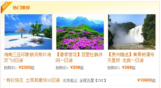 热门推荐,笔者认为这是一个旅游网站的核心内容,对于核心内容的展示一定要在首页完全的呈现给用户,因为这些热门的信息可以第一时间锁定旅游用户最终想要找到的地方,上图是贵州旅游网的热门推荐旅游景点的分布,在首页上方的中间显示的,不仅把旅游风景图展示了出来,还将普通价格和抢购价格展示了出来,由此可见网站的人们推荐是HOT的。 C:首页旅游团购页面和国内外旅游的分布