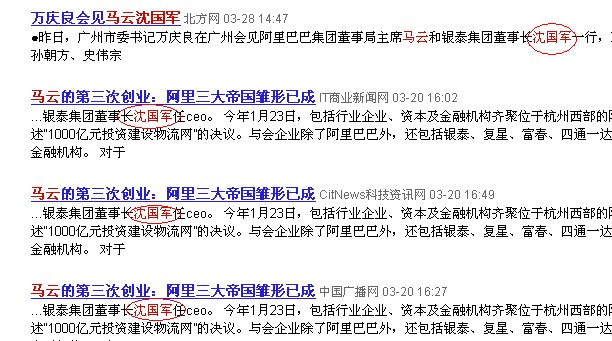 你在百度新闻人物里搜索马云,出现在与事件相关人物里的人,那里面的人物完全超出了关键词的范畴,跟马云这个词完全没一点关系了。大家看百度是如何进行判断的,大家看看图片就知道了。 估计百度是有一个人物库,这样就能可以统计最近这段时间马云和哪个人物经常出现在新闻源网站里,根据这个数量进行展示就好了。当然这方面虽然表现比较小,但可以说明的是百度是有这技术的。即便不通过链接也能判断出相关性来,我想这就是共同引用吧,相信未来还会加入一些语义分析的成分进来。