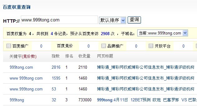 最近久久的一个做SEO的朋友说在淘宝上遇到一个SEO骗子,吹嘘可以几十元就可以给网站的百度权重刷上来,从权重1到权重6之间明码标价,价格也从几十元到几百元不等,此人淘宝用户名是“婷婷seo”,自吹靠什么给百度服务器发包手工提高百度权重,朋友问我这个可信不,是不是淘宝骗子。毫无疑问,这样的小伎俩只有淘宝骗子才干得出来,找一个刷流量的工具,直接给网站百度来路流量刷上来,把目标关键词或网址指数刷上来,百度权重自然就上来了。但是大家请切记,这里说的百度权重,不是百度关键词排名,而是站长工具统计出来的“百度权重”。既然提高的不是网站关键词百度排名,那么这样的权重可以说毫无意义! 大家都知道,这个百度权重不像谷歌PR,它不是百度官方提出来的,而是第三方平台chinaz站长工具和爱站网推出的针对网站关键词排名预计给网站带来流量,划分等级0-10的第三方网站欢迎度评估数据的参考值。 百度权重评级公式: 以下为chinaz站长查询定义的百度权重的规则: 百度预计流量0-99 权重1 百度预计流量100-499 权重2 百度预计流量500-999 权重3 1000-4999 权重4 5000-9999 权重5 10000-49999 权重6 50000-199999 权重7 200000 -999999 权重8 1000000以上 权重9 注意:以上是chinaz站长通过统计该网站所有有排行的关键词(一定要有百度指数的词),跟它所在的位置,反推算出来的预计流量;跟该网站的实际访问流量没有关系; 爱站网定义的规则跟此类似,数值不一样,而且预计流量计算方法不一样,所以同一个网站同一时间用两者查,显示的权重值可能不一样,有时候相差还比较大; 骗子作弊形式: 既然所谓的百度权重是百度来路流量来衡量的,那么及时网站没有百度排名,也可以制造人为的百度流量,别如通过刷网址在百度的来路流量,也一样可以提高权重,大致方法就是 输入网址,搜索后然后点击打开网站,清除COOKIE,然后换个IP重新循环执行,这样不停的刷百度来路流量,权重自然就提高了,没有什么高深的技术,这样刷的结果不会对网站的关键词排名有任何的帮助作用,刷多了甚至还会被百度认为是作弊,遭到K站的危险。还有,这样做即使给百度权重提高了,但是一看就是很假,是刻意作弊刷出来的假权重,在换友情链接的时候,别人不会看这样的虚假百度权重就和你换链接,别人只会看你的网站关键词排名和PR值以及百度快照和收录等。作弊刷出来的假权重,只会让SEO同行们鄙视你是一个菜鸟。下面给大家参考一个百度假权重的案例,此网站百度关键词全无,真实权重是0,但是被菜鸟刷出来之后的假权重是4。
