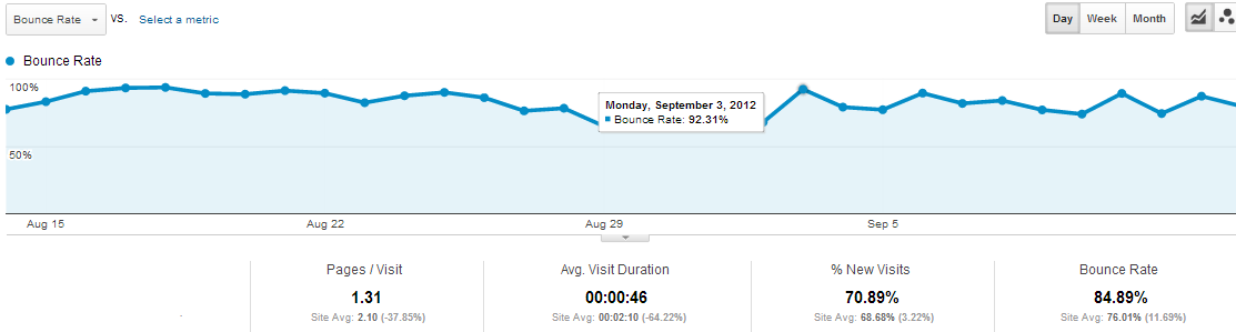 上图显示的是一个月来网站的流量。 8月15日之前:这个期间网站流量不错,他每天发布15到20篇原创文章。由于他的域名时间很久了,积累了一定的权重,所以被搜索引擎赋予了较高的权重,关键词排名都很不错。但还没有什么流量。 从8月15日至8月22日:由于大量原创文章,让搜索引擎给予了持续的权重,这一期间,从搜索引擎来的流量开始逐渐增大。但是一个很明显的问题产生了:在这一时期,网站的跳出率非常高,几乎达到了90%,也就是说,搜索引擎虽然带来了很多流量,但是访问者几乎没怎么看网站的内容。他们在网站上停留的时间平均为30秒。